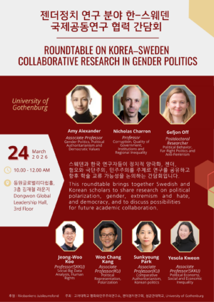 • 이번 간담회는 스웨덴과 한국 연구자들이 정치적 양극화, 젠더, 혐오와 극단주의, 민주주의를 주제로 연구를 공유하고 향후 학술 교류 가능성을 논의하는 간담회입니다. 많은 관심 부탁드립니다.
