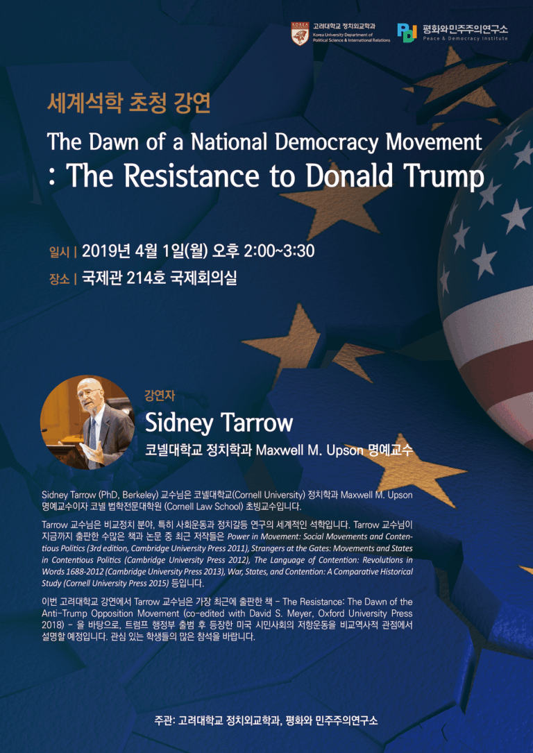 The Dawn of a National Democracy Movement: The Resistance to Donald Trump Sidney Tarrow 2019.03.15 일시 : 2019.4.1(월) 오후 2:00 ~ 3:30 장소 : 국제관 214호 국제회의실 발표 : Sidney Tarrow (Cornell University)