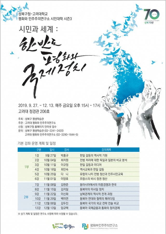 [시민대학 시즌3] 시민과 세계: 한반도 평화와 국제정치 2019.09.18 일시 : 2019.9.27~12.13, 매주(금) 오후 3~5시 장소 : 고려대 정경관 101호 참여 : 성북구민 누구나 강좌 신청 바로가기