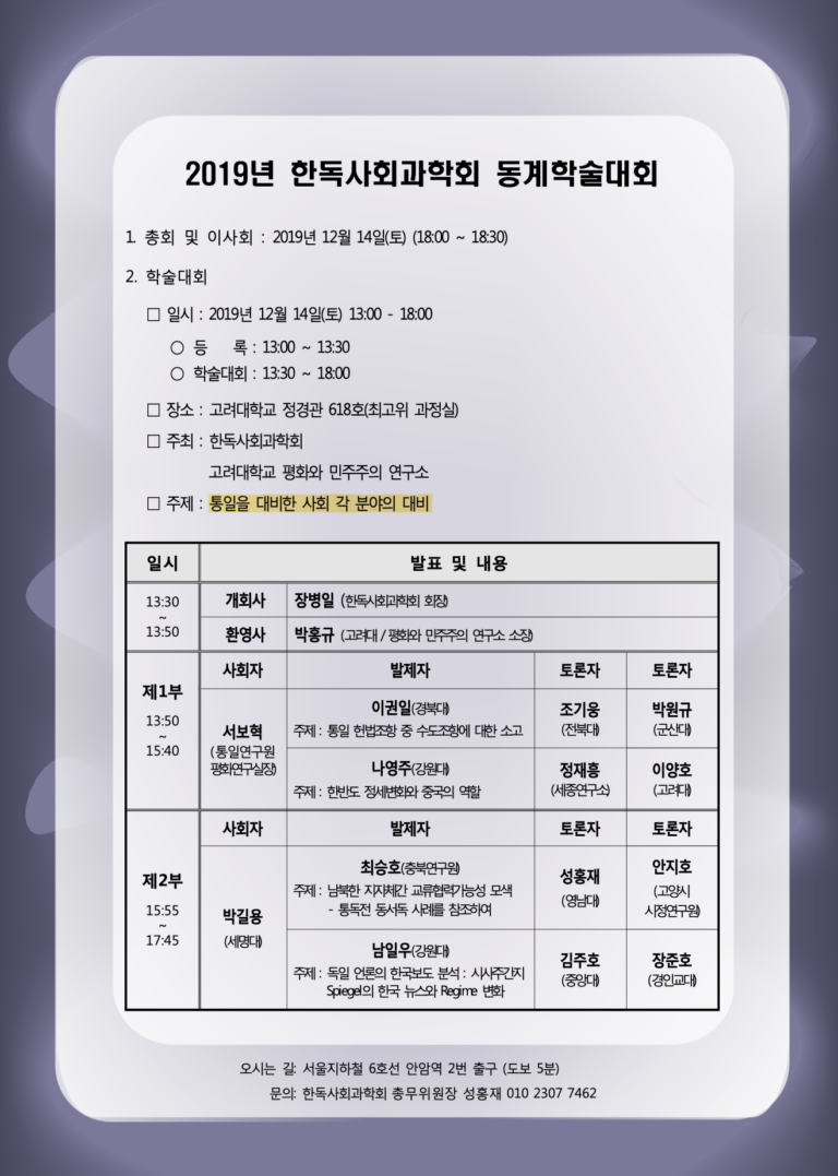 학술행사 공지 [시민대학 시즌4] 시민과 참여: 시민은 어떻게 정치의 주인이 되는가? 2020.10.05 일정 : 2020.10.15~11.13, 매주(금) 오후 2시~3시 30분 장소 : 온라인으로 진행 참여 : 성북구민 누구나 강좌 신청 바로가기 [지암 연구 워크숍 #1] Human Security and Korean Foreign Policy Lessons from Canada and Australia 2020.10.03 일시 | 2020.10.05(월) 17:00- 20:00 장소 | 정경관 412호 문의 | junmobaby@naver.com [한국연구재단] 2020년 제2차 연구윤리포럼 2020.09.16 일시 : 2020년 9월 22일(화) 13:00 ~16:00 주제 : 연구윤리의 새로운 지평 – 이슈와 대응 개최 방식 : 온라인(웨비나 형식) 포럼 개최 접속 URL : http://www.gaon24.co.kr/kaoas/index.html [정경대학 심포지엄 #2] 포스트 코로나(COVID-19) 시대 우리 사회의 변화와 대응: 사회적 위험과 개인의 인권, 자유, 프라이버시 2020.06.16 정경대 온라인 심포지움 보기 일시 : 2020.6.18(목) 16:30~18:00 장소 : 유튜브 고려대학교 정경대학 채널 발표 : 임현 (행정학과) / 김헌준 (정치외교학과) [정경대학 심포지엄 #1] 포스트 코로나(COVID-19) 시대 우리 사회의 변화와 대응: 국가위기와 리더십, 정부의 변화 2020.05.22 정경대 온라인 심포지움 보기 일시 : 2020.5.28(목) 16:30~18:00 장소 : 고려대학교 정경관 618호 최고위과정실 발표: 박홍규 (정치외교학과) / 박상수 & 김범수 (경제학과) / 최상옥 (행정학과) 통일을 대비한 사회 각 분야의 대비 2020.01.30 일시 : 2019.12.14(토) 13:00~18:00 장소 : 고려대학교 정경관 618호 최고위과정실 Information and the Effectiveness of Public Protests Rebecca Morton 2019.11.18 일시 : 2019.11.22(금) 오후 2:00 ~ 4:00 장소 : 정경관 618호 발표 : Rebecca Morton (New York University) [시민대학 시즌3] 시민과 세계: 한반도 평화와 국제정치 2019.09.18 일시 : 2019.9.27~12.13, 매주(금) 오후 3~5시 장소 : 고려대 정경관 101호 참여 : 성북구민 누구나 강좌 신청 바로가기 The Dawn of a National Democracy Movement: The Resistance to Donald Trump Sidney Tarrow 2019.03.15 일시 : 2019.4.1(월) 오후 2:00 ~ 3:30 장소 : 국제관 214호 국제회의실 발표 : Sidney Tarrow (Cornell University) [CSPL] 대한민국 지방정부는 누가 지배하는가? 2019.01.14 일시 : 2019.1.15(화) 15:00~ 장소 : 고려대학교 정경관 618호 최고위과정실