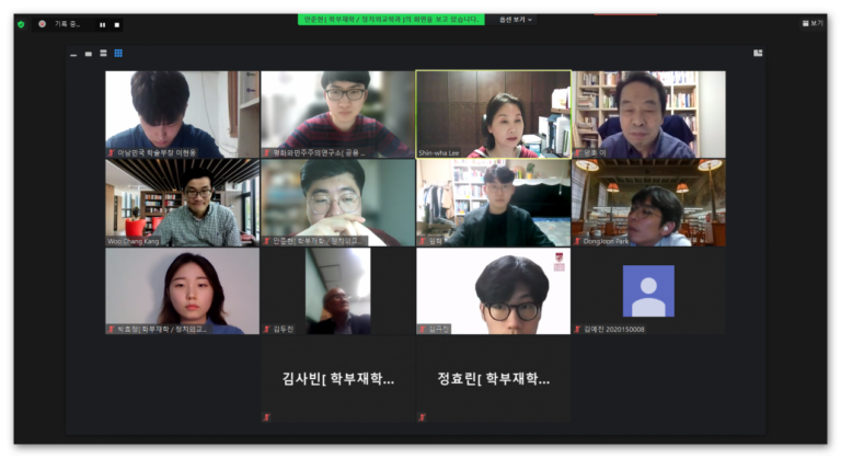 On May 21, 2021, from 21:30 to 22:30, the Peace and Democracy Institute and the Department of Political Science and International Relations held a zoom meeting with Director Lee Shin-hwa to present the second semester Pol in Love achievement. Group A: Song Jong-ho, political reporter at Seoul Economist ( Seoul Economic Daily) & Park Seon-Kyung, Professor of Political Science and International Relations at Incheon University / Hyun In-Taek, Former Minister of Unification Group B: Oh Joon, Former UN Ambassador / Shin Beom-Cheol, Director of the Center for Security and Unification at the Asan Institute for Policy Studies Group C: Kim Young-bae, 21st National Assemblymember / Im Hyuk-Baek, former professor of Political Science and International Relations at Korea University / Tae Young-ho, 21st National Assemblymember) In January, Korea University Peace and Democracy Institute, in association with the Department of Political Science and International Relations launched the Pol in Love Program. It⋯
