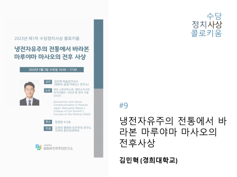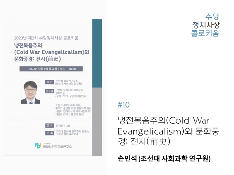 Topic: Cold War Evangelicalism Presenter: Minseok Son (Chosun University) Date: June 1, 2023 ㅣ 17:00~18:30 Venue: Political Science and Economics Building 412 On June 1, 2023, the Peace and Democracy Institute, together with Korea University’s Department of Political Science and International Relations, invited Professor Minseok Son from Chosun University to hold the 10th Soodang Political Thoughts Colloquium. The author presented his work titled “Cold War Evangelicalism”.