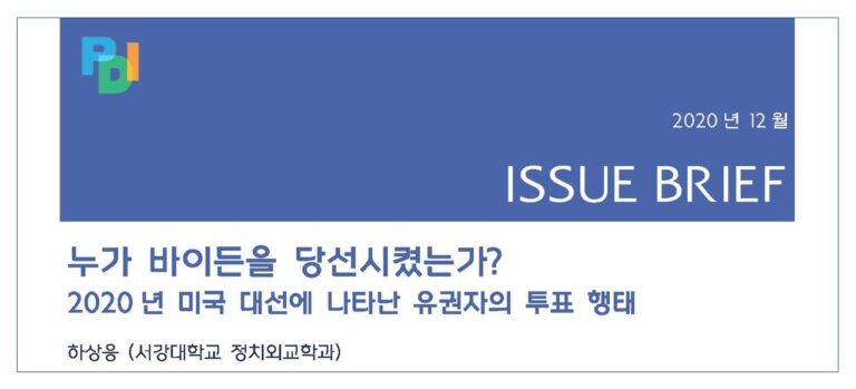 In this issue brief, Professor Shang E. Ha (Professor of political science, Sogang University) analyzes which group of voters delivered Joe Biden his victory in the 2020 presidential election. Was it the white voters without college degrees or the racial minority populations? This is an important question because it will be difficult for the Democratic party to hold the support of both. Professor Ha analyzes exit poll results and the votes from Wisconsin, Michigan, Pennsylvania, Georgia and Arizona, the five most important states in the 2016 and 2020 elections, and concludes that the white voters in the swing states were the most crucial to Biden’s victory. While the inter-party differences between the moderates and progressives remain a considerable challenge, the future of the Democratic Party lies in the decision of which voters it will respond to. You can download the full text of the issue brief (in Korean) here: [이슈브리프⋯