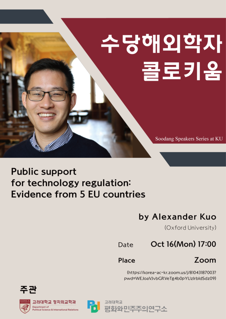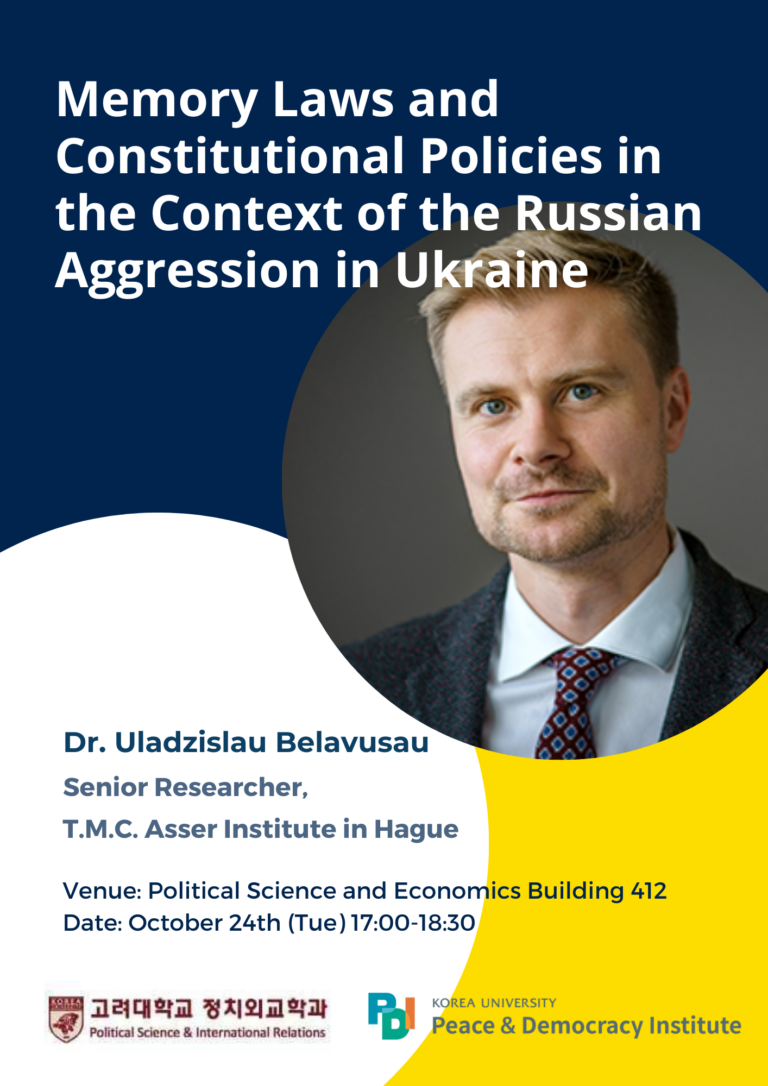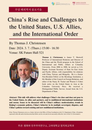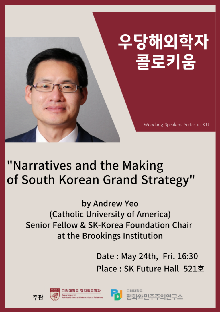 “Narratives and the Making of South Korean Grand Strategy”. Speaker: Professor Andrew Yeo (Brookings Institution, The Catholic University of America) Topic: “Narratives and the Making of South Korean Grand Strategy”. Date and Time: 4:30am, Friday, 24, May, 2024. Venue: Room 521, Korea University SK Future Hall Andrew Yeo is a senior fellow and the SK-Korea Foundation Chair at Brookings Institution’s Center for Asia Policy Studies. He is also a professor of politics at The Catholic University of America in Washington, D.C. Yeo is also the author or editor of six books including State, Society, and Markets in North Korea (Cambridge University Press 2021), Asia’s Regional Architecture: Alliances and Institutions in the Pacific Century (Stanford University Press 2019) and Activists, Alliances, and Anti-U.S. Base Protests (Cambridge University Press 2011). His next book is a forthcoming co-edited volume (with Isaac Kardon) on Great Power Competition and Chinese, Russian, and American Force Posture in the⋯