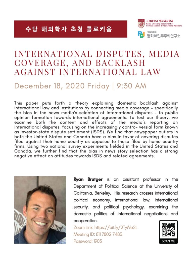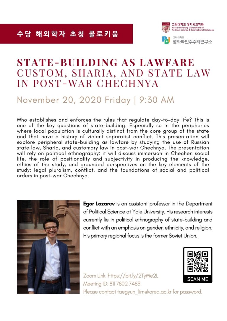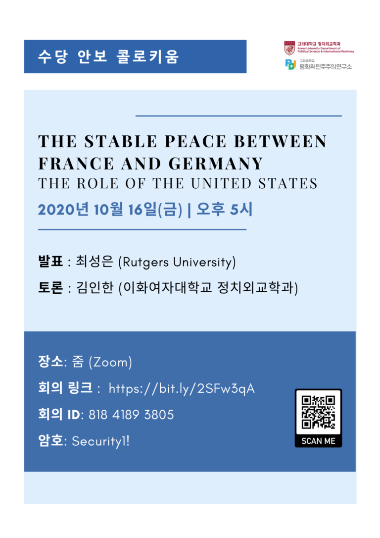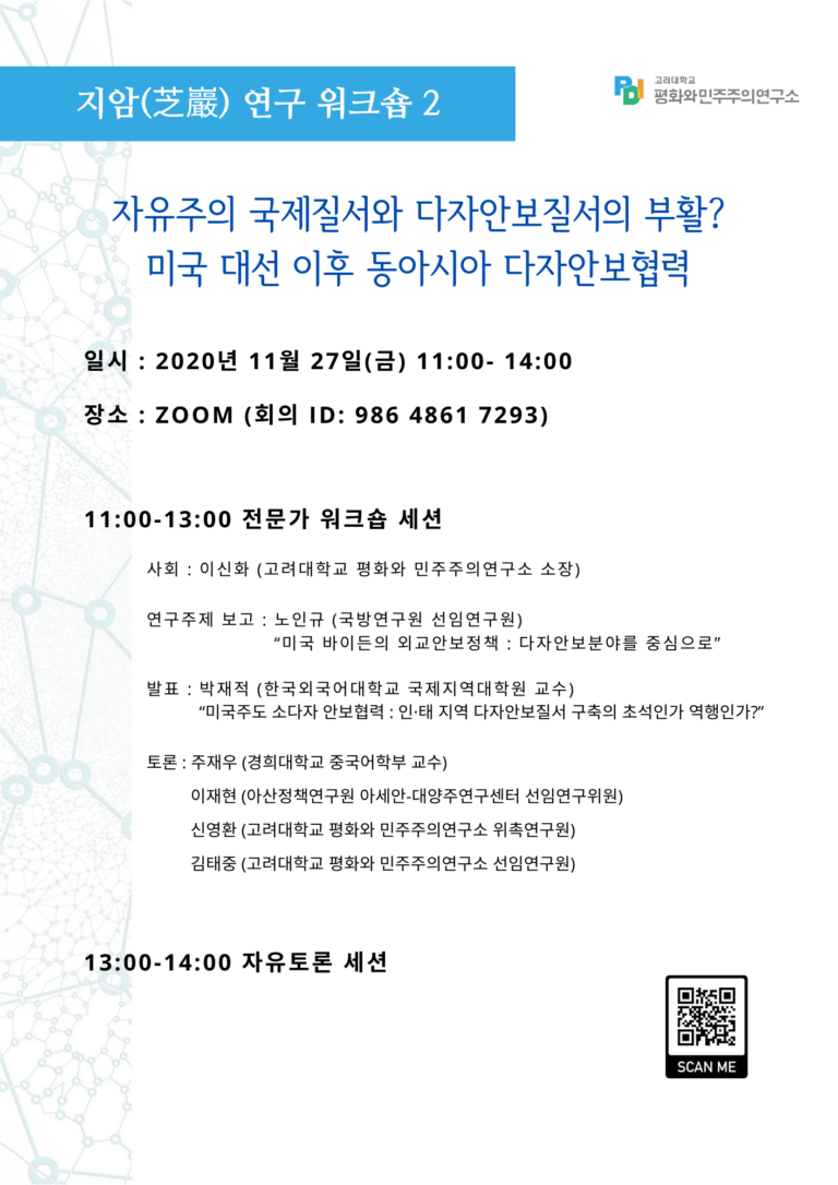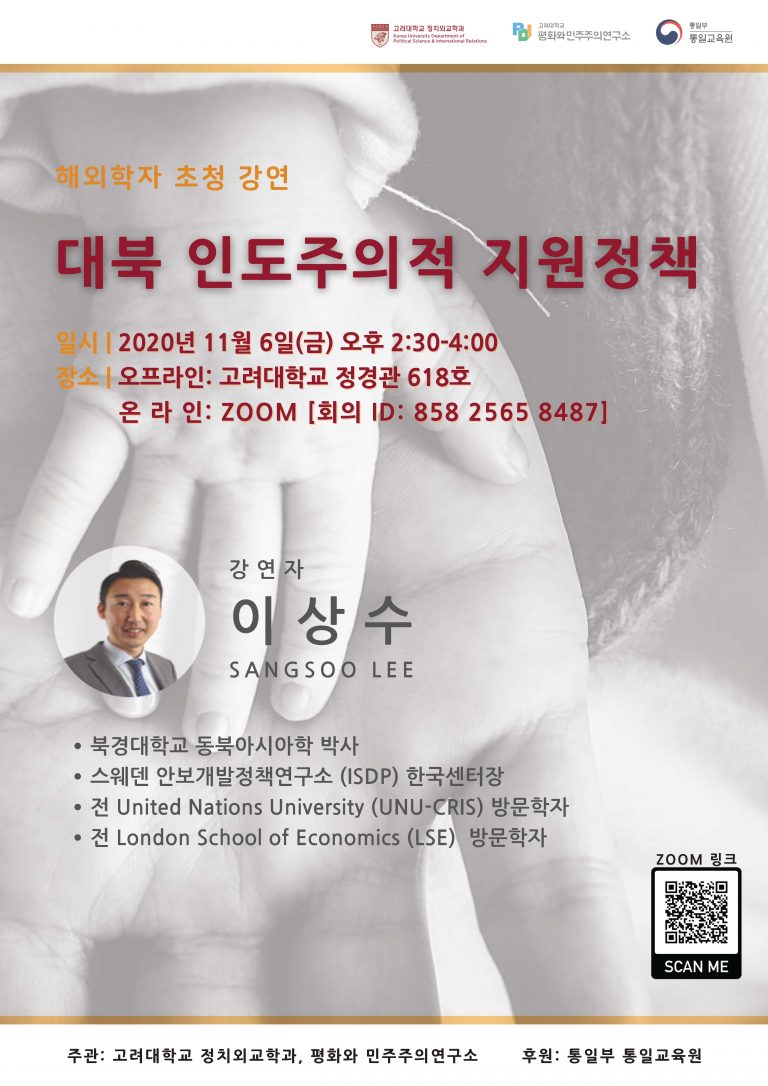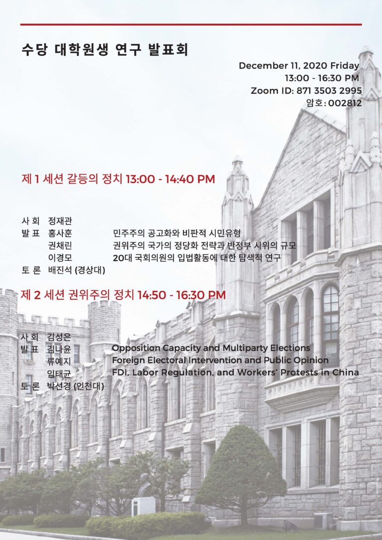 Author: Seung Joon Paik (Korea University Peace and Democracy Institute) Discussant: Hyun Jin Choi (Kyung Hee University Department of Political Science) Date and time: December 12, 2020 (Friday) / 17:00 Zoom link: https://bit.ly/2SFw3qA Meeting ID: 81841893805 (password: Security1!) Rules for participation: Anyone interested in the topic can join the meeting using the above link without prior registration. However, we advise you to download and read the paper in advance.