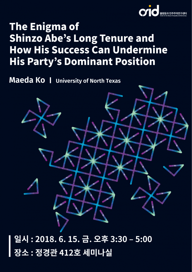 [CSID] The Enigma of Shinzo Abe’s Long Tenure and How His Success Can Undermine His Party’s Dominant Position 2018.06.10 Date : Fri, 15 June 2018, 15:30~17:00 Venue : 412, Political Science and Economics Bldg., Korea Univ. Presenter : Maeda Ko (Univ. of North Texas)