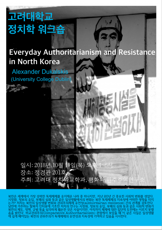 [Political Science Workshop] Everyday Authoritarianism and Resistance in North Korea 2018.09.27 Date: Thursday, October 11 2018, 16: 00 ~ 18: 00 Venue: 201, Political Science & Economics Bldg., Korea University Presenter: Alexander Dukalskis (University College Dublin)