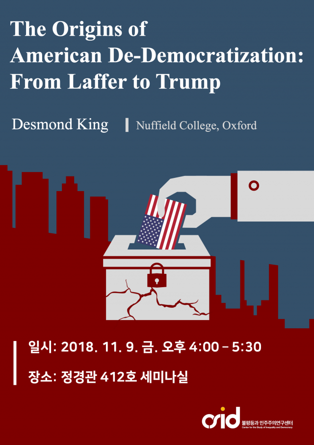 [CSID] The Origins of American De-Democratization: From Laffer to Trump 2018.11.05 Date: Friday, November 9, 2018 16:00 ~ 17:30 Venue: Seminar room(412), Political Science and Economics Bldg, Korea Univ. Presenter: Desmond King (Nuffield College, Oxford)