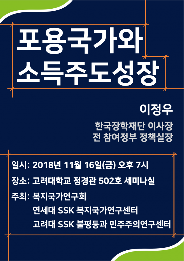 [CSID] Embracing Country and Income-led Growth 2018.11.13 Date : Friday, November 16, 2018, 19:00 Venue : 502, Political Science & Economics Bldg., Korea University Presenter : Joung-Woo Lee (Chairman of Korea Student Aid Foundation)
